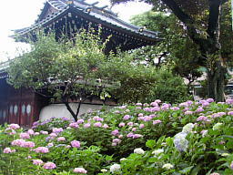 地下鉄の駅や周囲の地名、通りの名前に「白山」が引用されている割にはこぢんまりとした境内には、模擬店のテントばかりがひしめいて、肝心のあじさいは本堂前の参道に一列に咲いている程度だ。このくらいならどこでも見られると失望して帰っていく人も少なくないが、実は、あじさいの名所は本堂の裏にある。