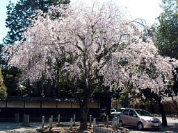 仏殿の前にある方はもう葉桜になっていたけれど、その奥のしだれ桜はちょうどイイ感じ。根方には車が停まっていて、その向こうには武家屋敷のような塀が見える。どこかの地方都市で見る景色のようだ。