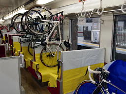 「東京・南会津サイクルトレイン」の特徴は、自転車をそのまま車内に持ち込めること。東武鉄道浅草駅まで自走できれば、煩わしい分解・組立の手間が無く、スッと乗ってスッと降りたらすぐに走り出せる。
