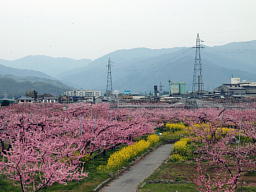 山梨市の下神内川水車小屋広場(かのがわ広場)で開かれている桃の花祭りに立ち寄ってみた。桃畑を縁取るように菜の花が植えられていて、ピンクと黄色の取り合わせが素敵だ。