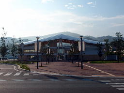 温泉施設内には日本画家・千住博によるタイル画が飾られ、3階は町を一望する展望テラスになっている。駅前広場には無料の足湯もあるのだが、時間が合わず、残念なことに行った時にはまさに湯を抜かれた直後だった。