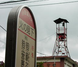 旧甲州街道に「火の見下」というバス停がある。調布市消防団第3分団の後ろに建つ下石原公会堂の屋上に、半鐘をつるした火の見櫓が見える。
