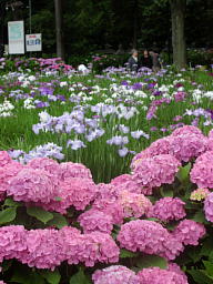 よく手入れされた花菖蒲が美しいのはもちろんだが、ここのよい所は、ショウブ園のぐるりを囲むようにして色とりどりのアジサイが植えられている所だ。花菖蒲と紫陽花を同時に楽しめて二倍にお得、というわけ。
